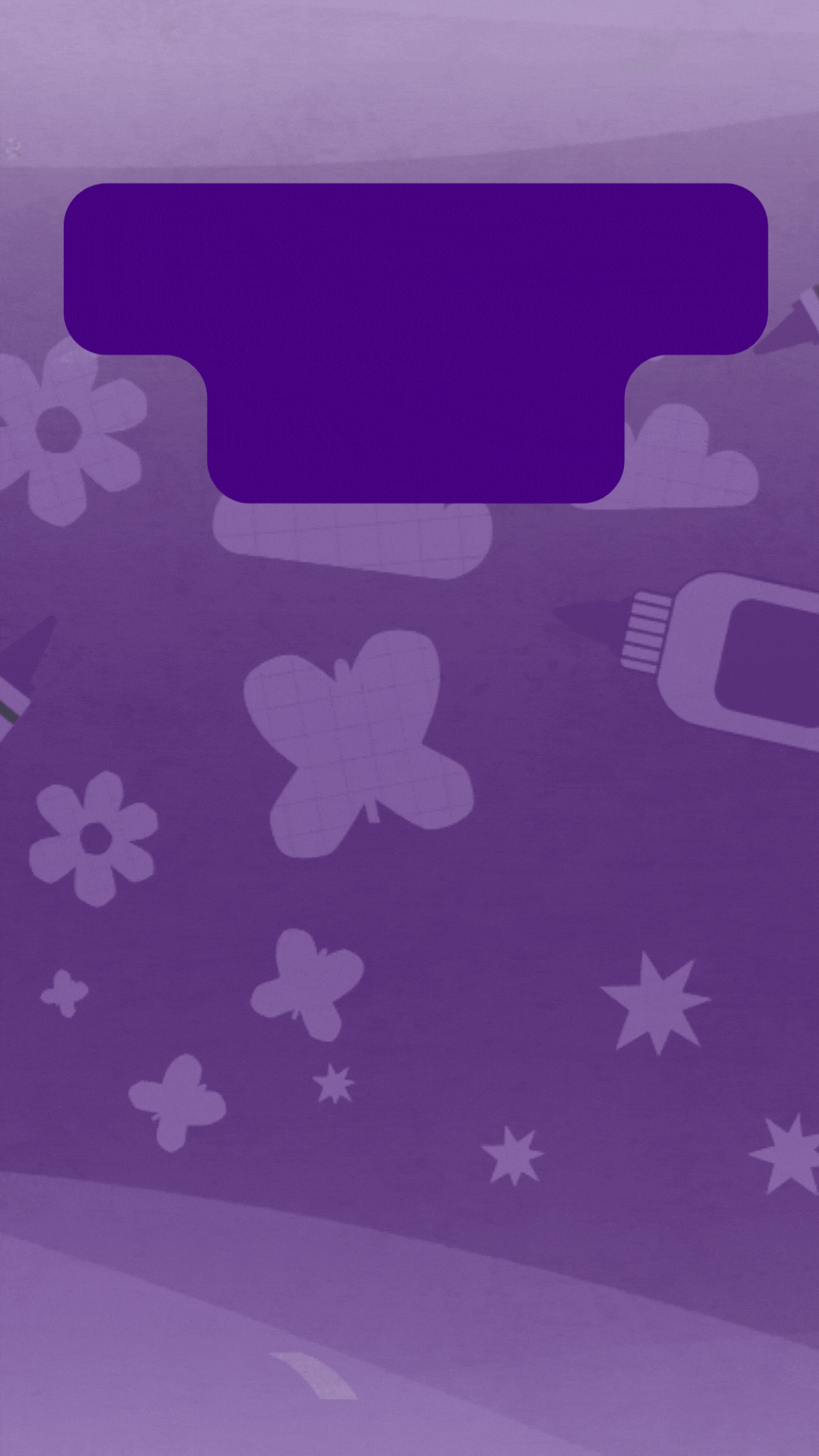 A purple background with butterfly, flower, star, and bottle illustrations. A dark purple speech bubble is centered at the top.